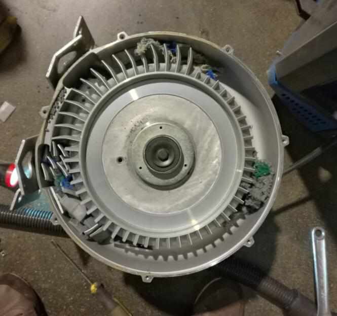圖為損壞之后的葉輪,因進(jìn)風(fēng)口吸進(jìn)去雜物,導(dǎo)致四周的葉片被堅硬物打碎。所以一要定做好進(jìn)風(fēng)口的防護工作。