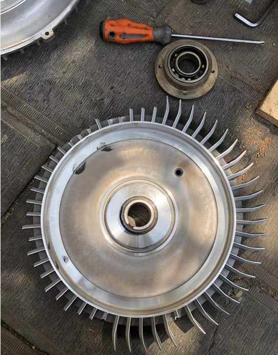 如何下圖所示,軸承損壞,滾珠脫落,導(dǎo)致風(fēng)機(jī)葉輪大面積損壞,需要更換新的葉輪及新的軸承才行,此高壓鼓風(fēng)機(jī)配套使用的軸承為高速耐高溫原裝進(jìn)口nsk軸承,如果客戶自己更換成國內(nèi)品牌或質(zhì)量差的軸承,使用不了多長時(shí)間,就會損壞。所以一定要注意。